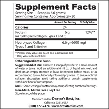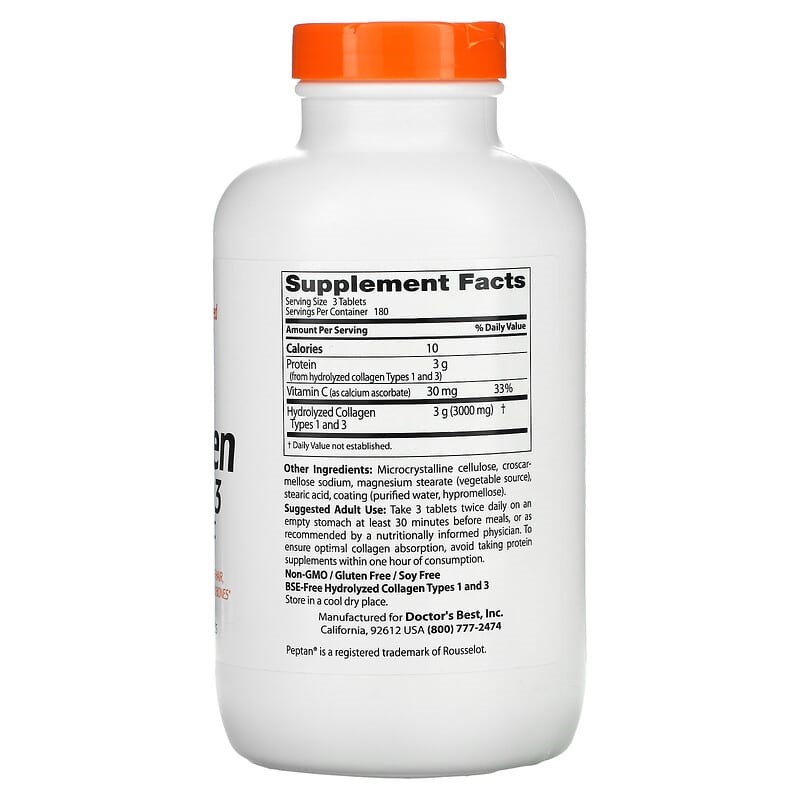 Doctor's Best Collagen Types 1 and 3 - 180 Tablets The Doctor's Best Collagen Types 1 and 3 is pure collagen protein. Warnings: Keep out of reach of children. Notes: Non-GMO. Gluten free. Contains nothing other than listed ingredients. Recommended Use: Take 3 tablets twice daily on an empty stomach at least 30 minutes before meals. Do not mix with other protein powder supplements.